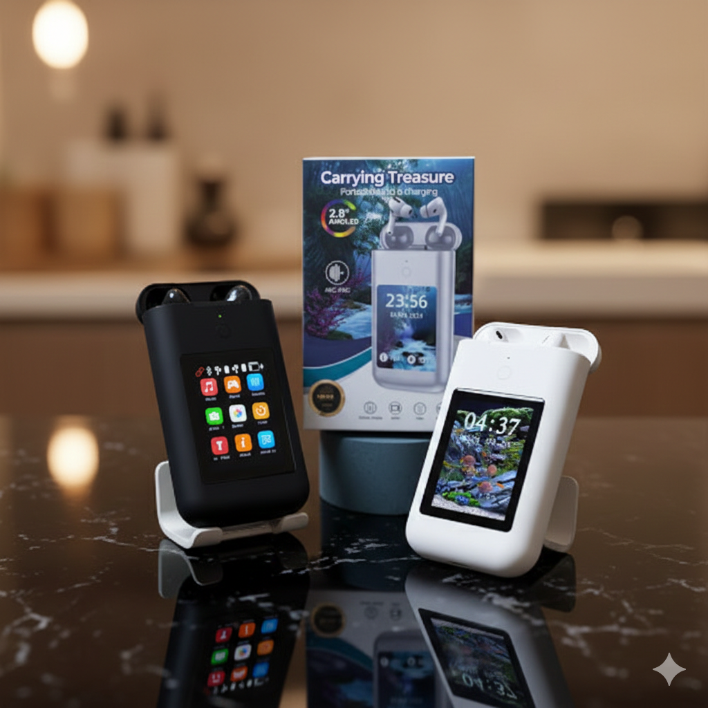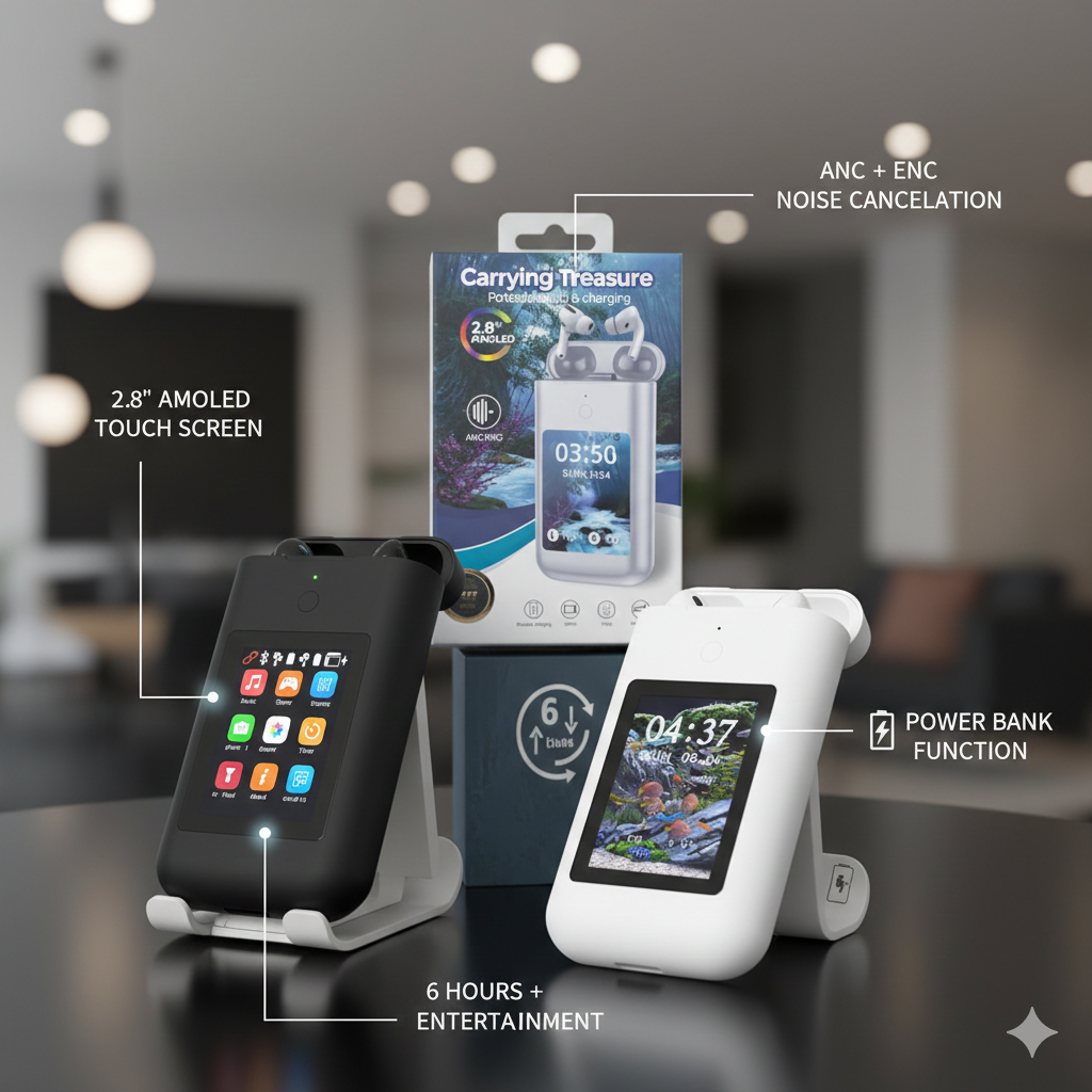 Pantalla AMOLED Inteligente de 2.8": Controla tu música, visualiza la hora y personaliza tu fondo de pantalla directamente desde el estuche. ¡Tecnología táctil de última generación!